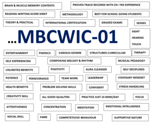 THIS CURRICULUM ENHANCES THE THREE SENSES LIKE SIGHT, HEARING AND TOUCH, MBCWIC-01 INCREASES POWER OF CONCENTRATION WHICH DEVELOPS KID TO BE MORE ATTENTIVE AND PRECISE SENSE OF MUSICAL KNOWLEDGE TOO. THIS CURRICULUM WILL NOT ONLY BE EFFECTIVE DURING SCHOOL DAYS BUT THROUGH OUT THEIR LIFE STYLE